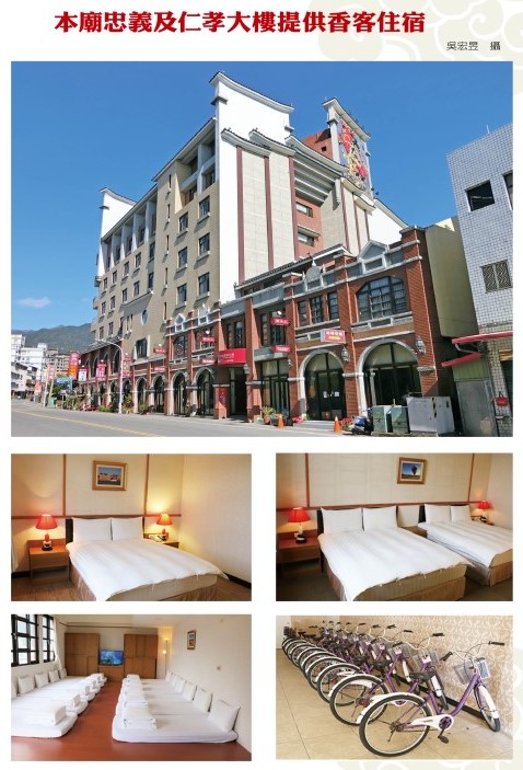 香客大樓有忠義及仁孝大樓2棟,各種房型齊全,歡迎來廟進香的團體遊客,或者個人進香的單獨散客住宿。(請使用電話聯絡)