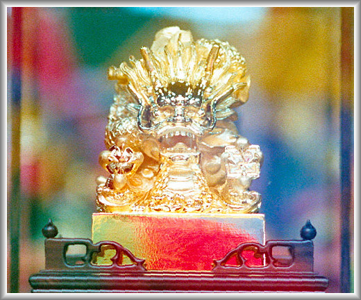 註:欣逢建廟二百週年大典,本廟將信徒自民國75年7月9日起奉獻之大小金牌共5482面及金項鍊1條,鑄造成第一顆《關聖帝君—金龍印》,於92年10月19日晉獻殿前。 【印文:勅建礁溪協天廟三界伏魔大帝神威遠震天尊關聖帝君】